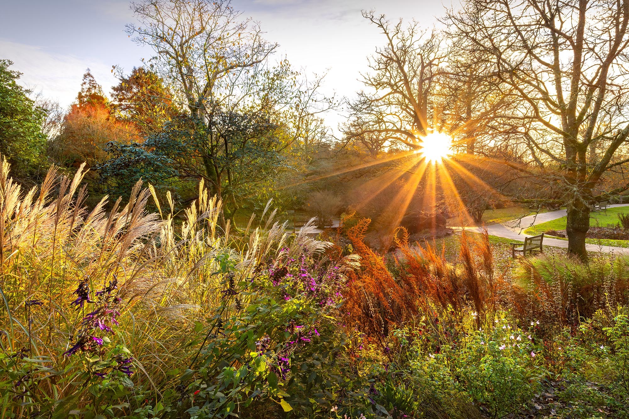 Evening light over the beds with ornamental grasses and late sage in the Water Gardens in November