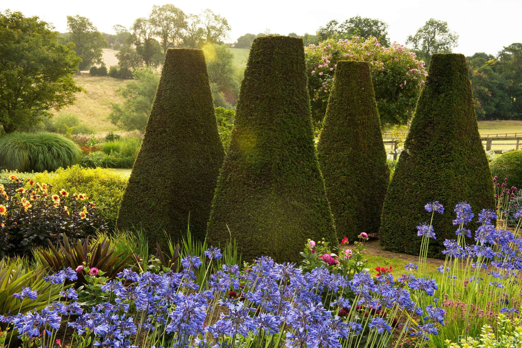 Agapanthus and topiary at sunrise in Pettifers Garden