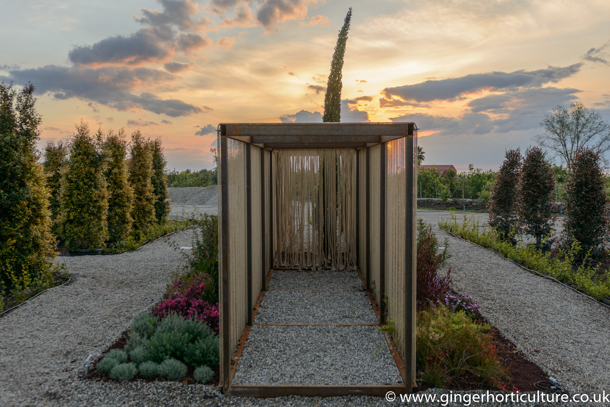 The landscape and gardens of Austin, Texas, are captured in this garden’s design, Corten steel and sandstone, materials commonly used in the region, are a significant part of the garden’s hard landscaping. A structure made from aged, rusting scaffold poles topped with corrugated iron and a water feature constructed from blocks of natural stone set in a circle and supporting a corten steel bowl form the focal points. The pathways are constructed from crushed stone and reflect the colours found in the region, with boulders creating a feeling of the Texan landscape. The planting includes Echinacea, Acacia, Agave, Ratibida and Coreopsis