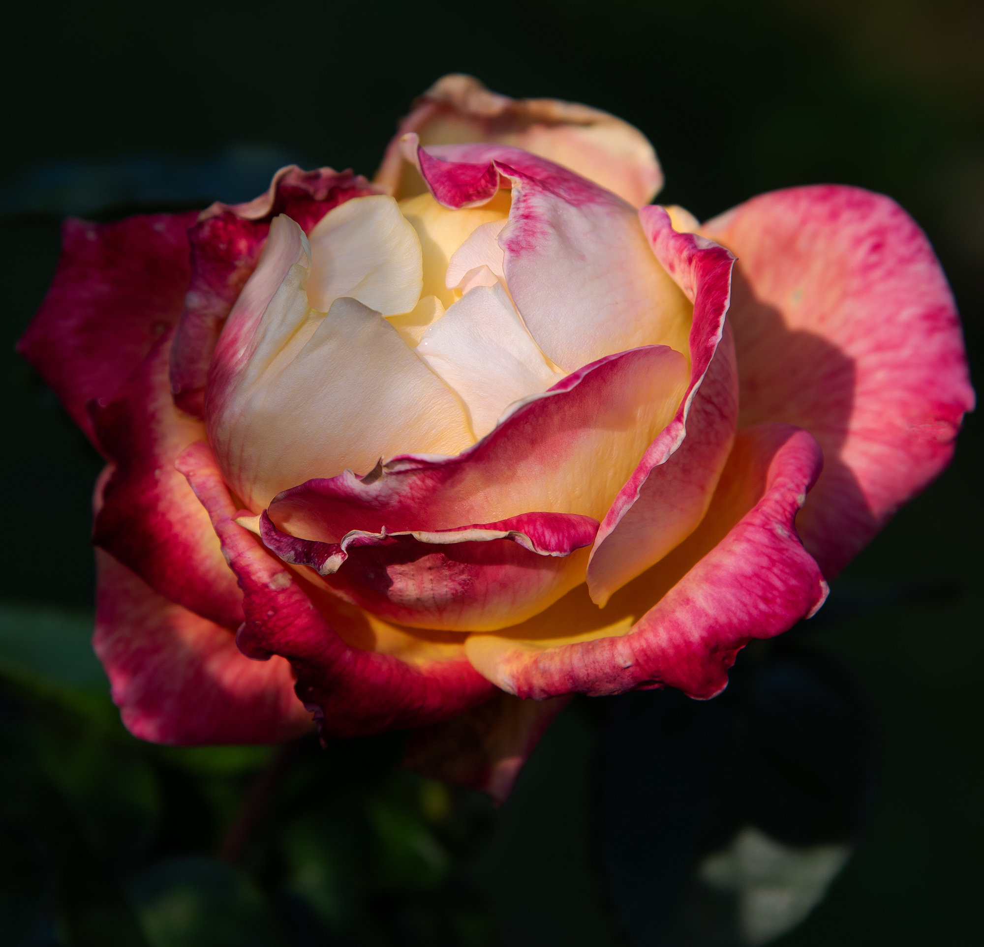 Rosa 'Munstead Wood' with curvaceous petals lit by afternoon light and shade seems like red velvet