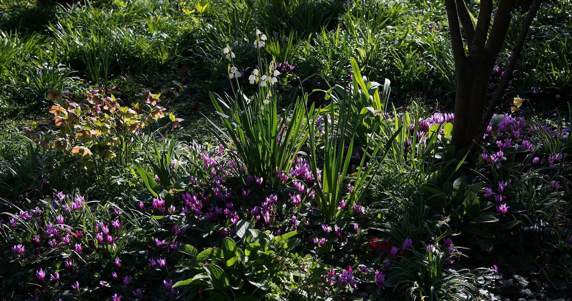 A profusion of reddish pink Cyclamen repandens cover the ground, amongst spring bulbs, Helleboreus orientalis and dazzling white Leucojum aestivus in dappled shade